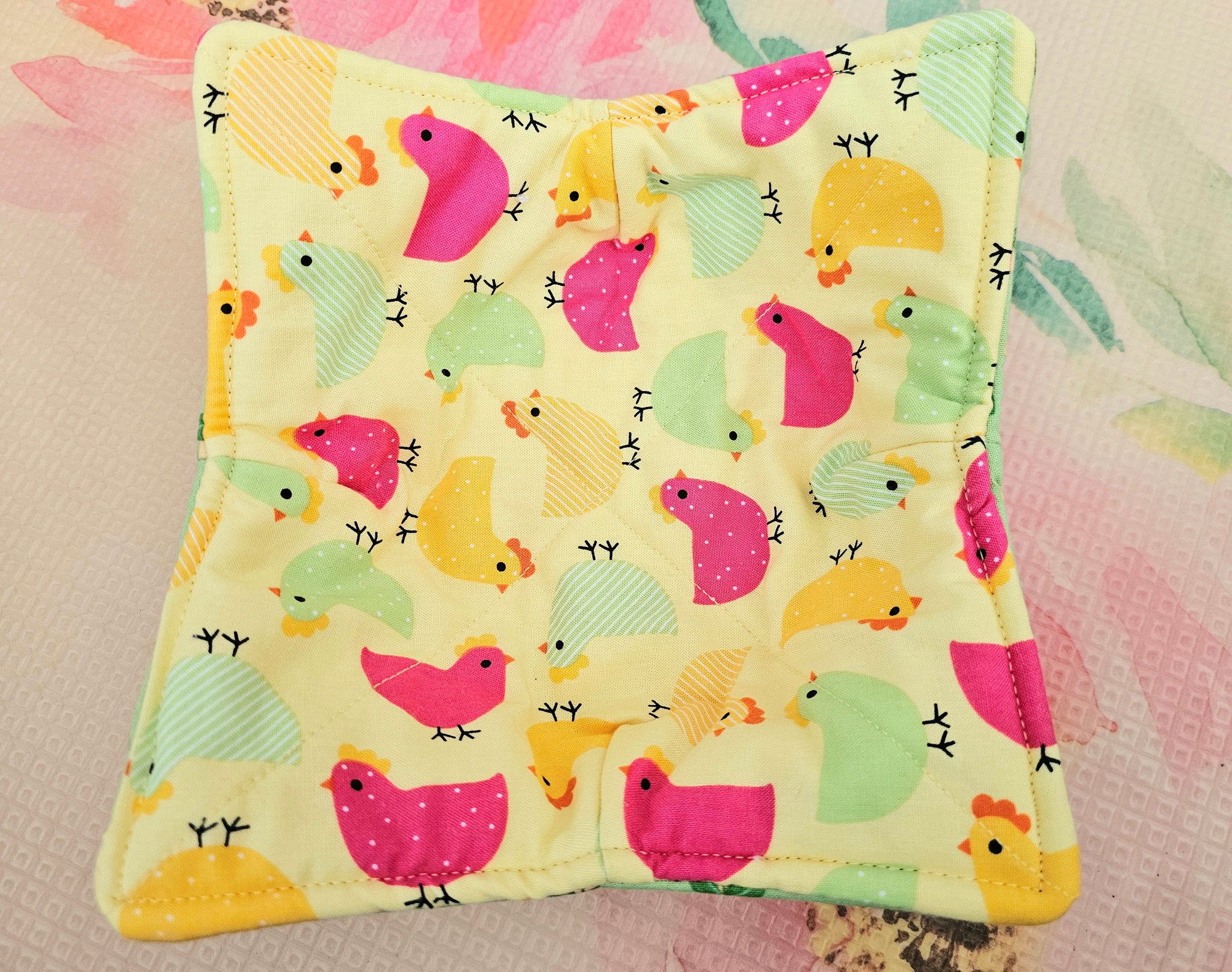 It is made out of 100% cotton fabric, 100% cotton thread & a double layer of cotton batting and is reversible & washable.