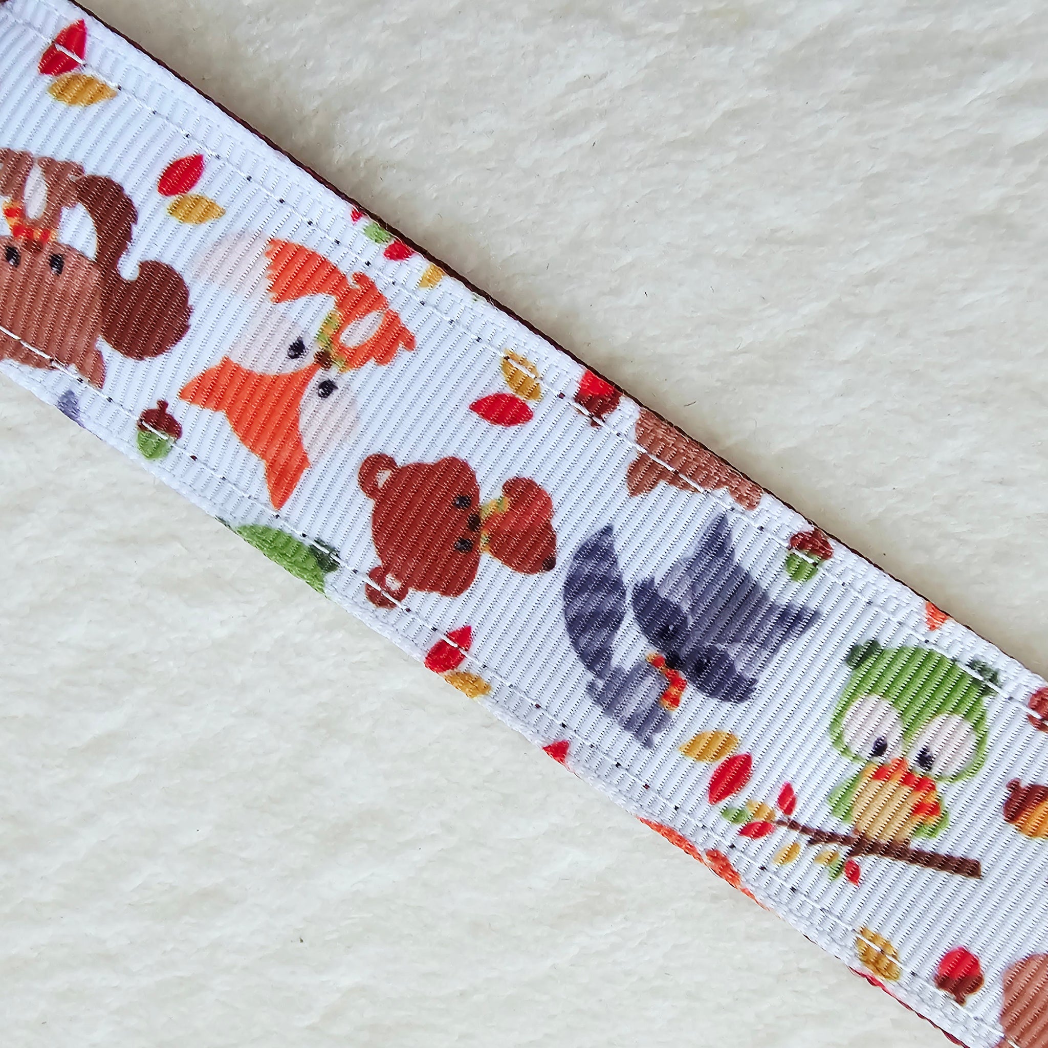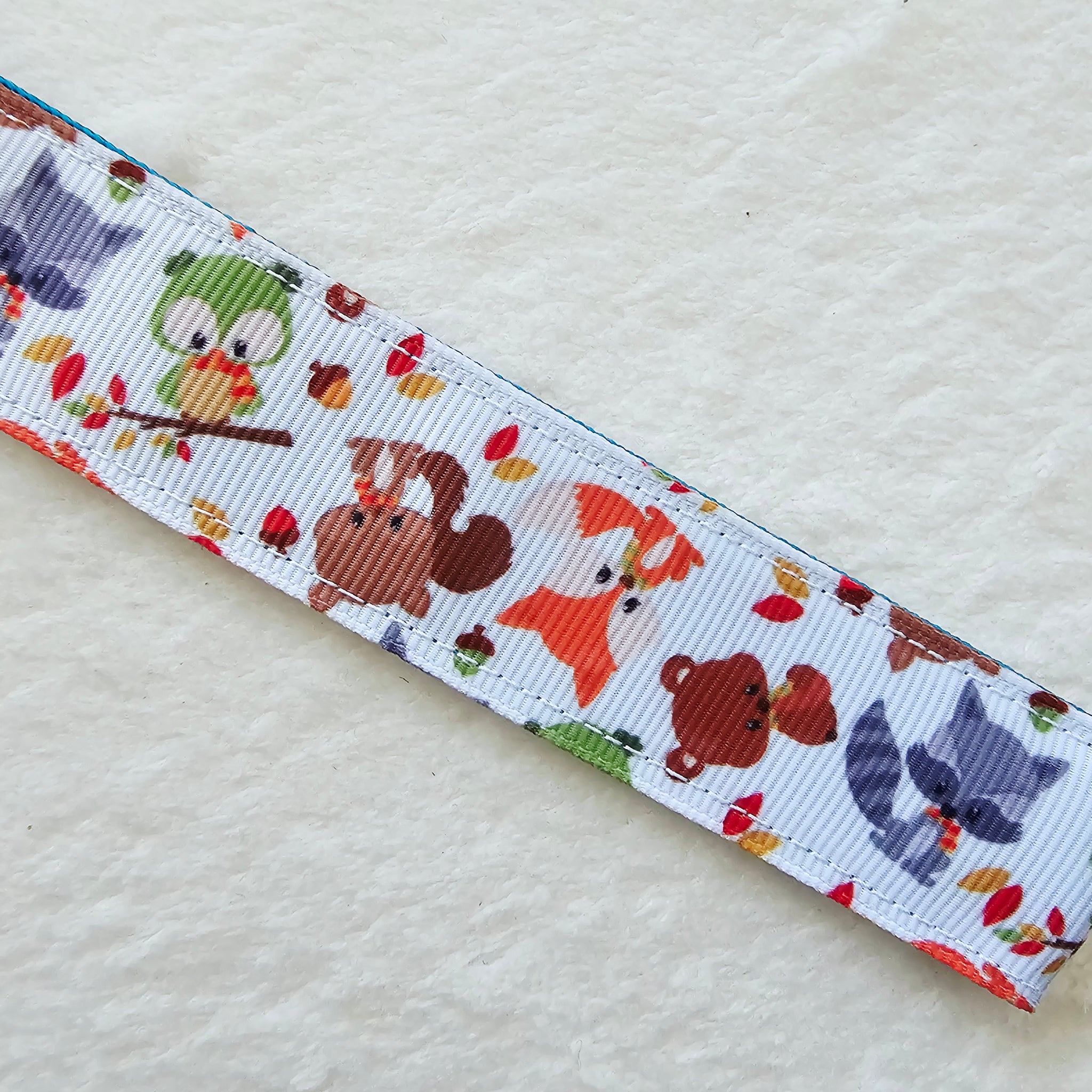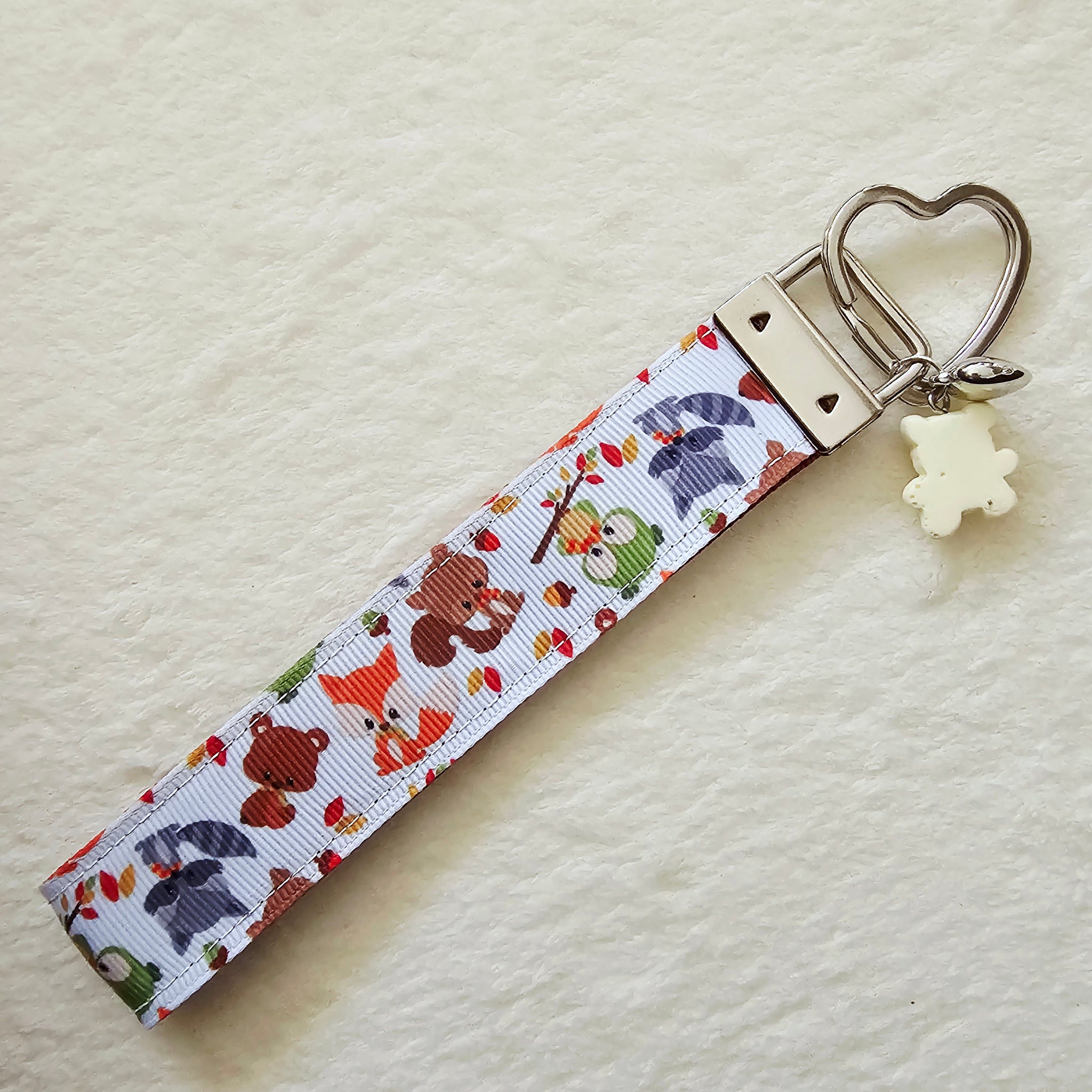 This listing is for super cute forest friends key fob on a teal or maroon webbing. It also comes with an adorable bear charm. The teal has a darker colored bear and the maroon a lighter colored bear.
