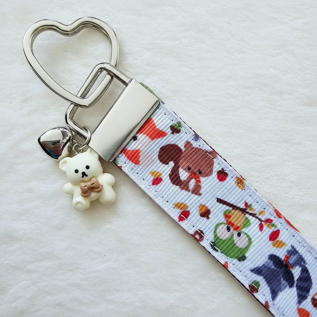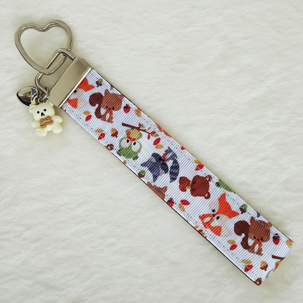 Adorable Fall Forest Friends on White Key Fob on Silver