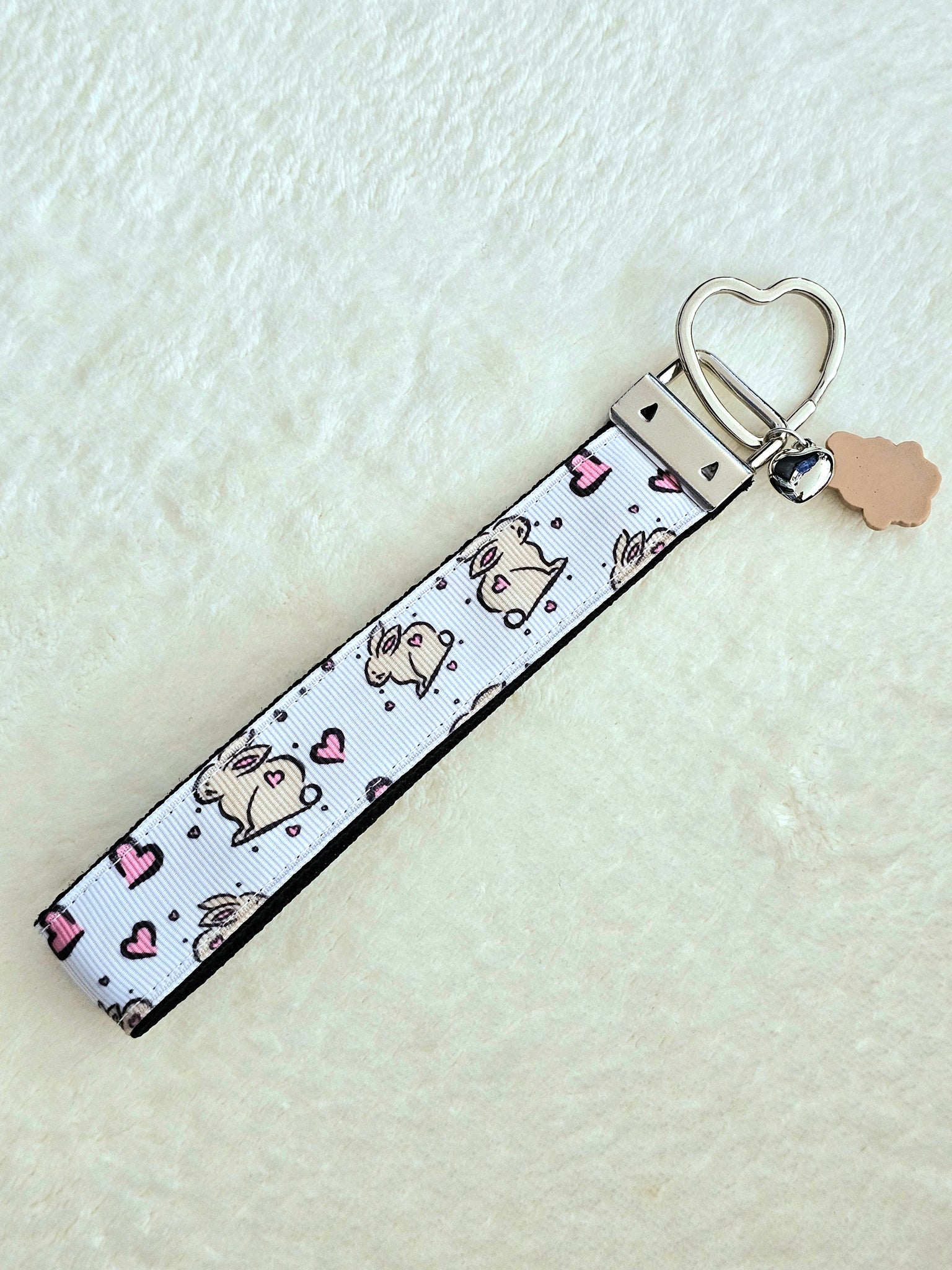 This is for one brown bunny with pink hearts keychain/wristlet/fob - it is sewn onto a pink or purple poly webbing and held together with Rose Gold hardware.