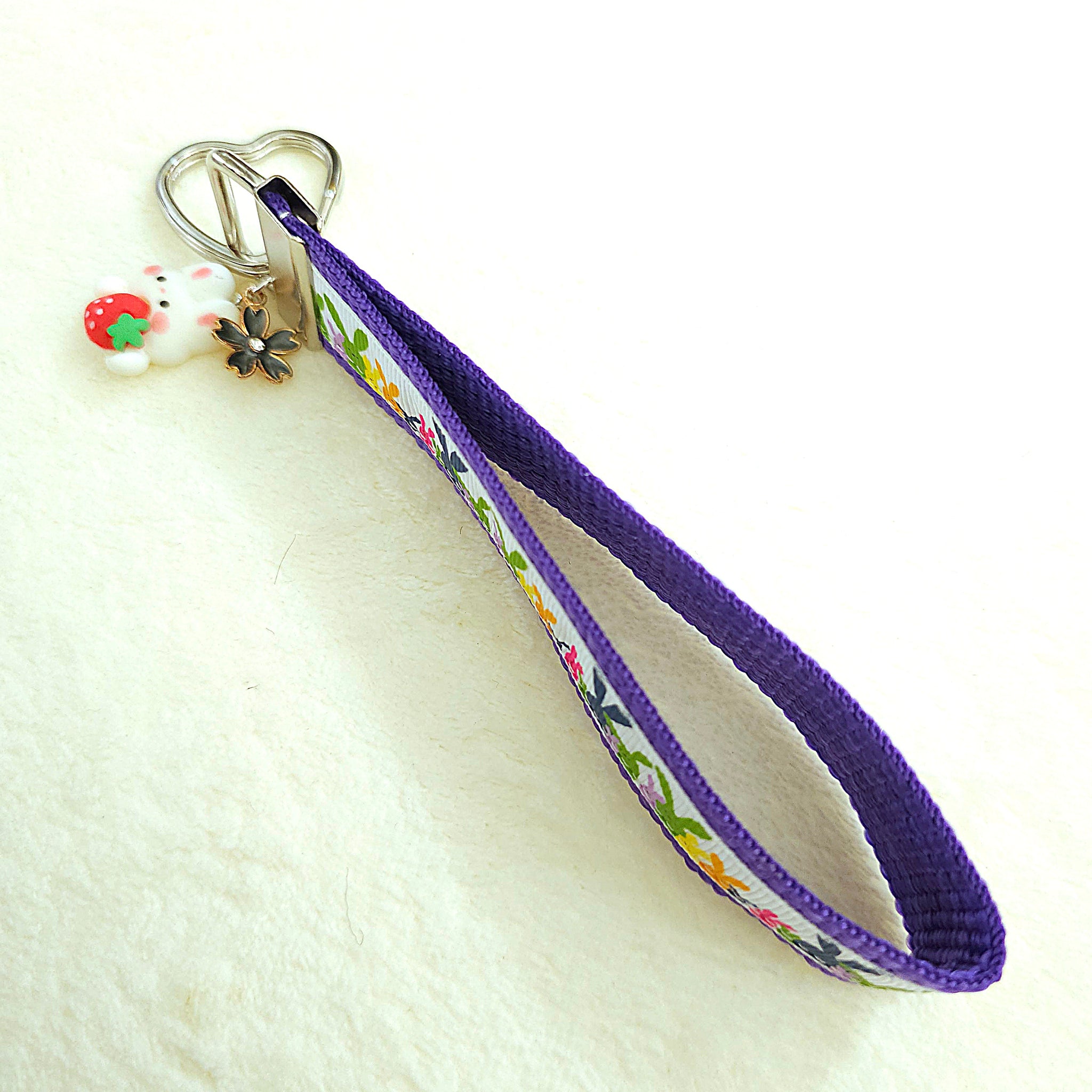 This listing is for a adorable bunny key fob. The key fob is held together with a silver clasp and includes a bunny and flower charm to make it even more cute!