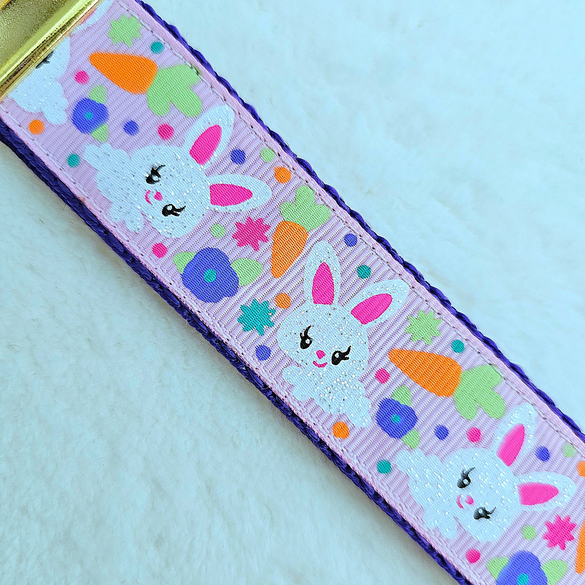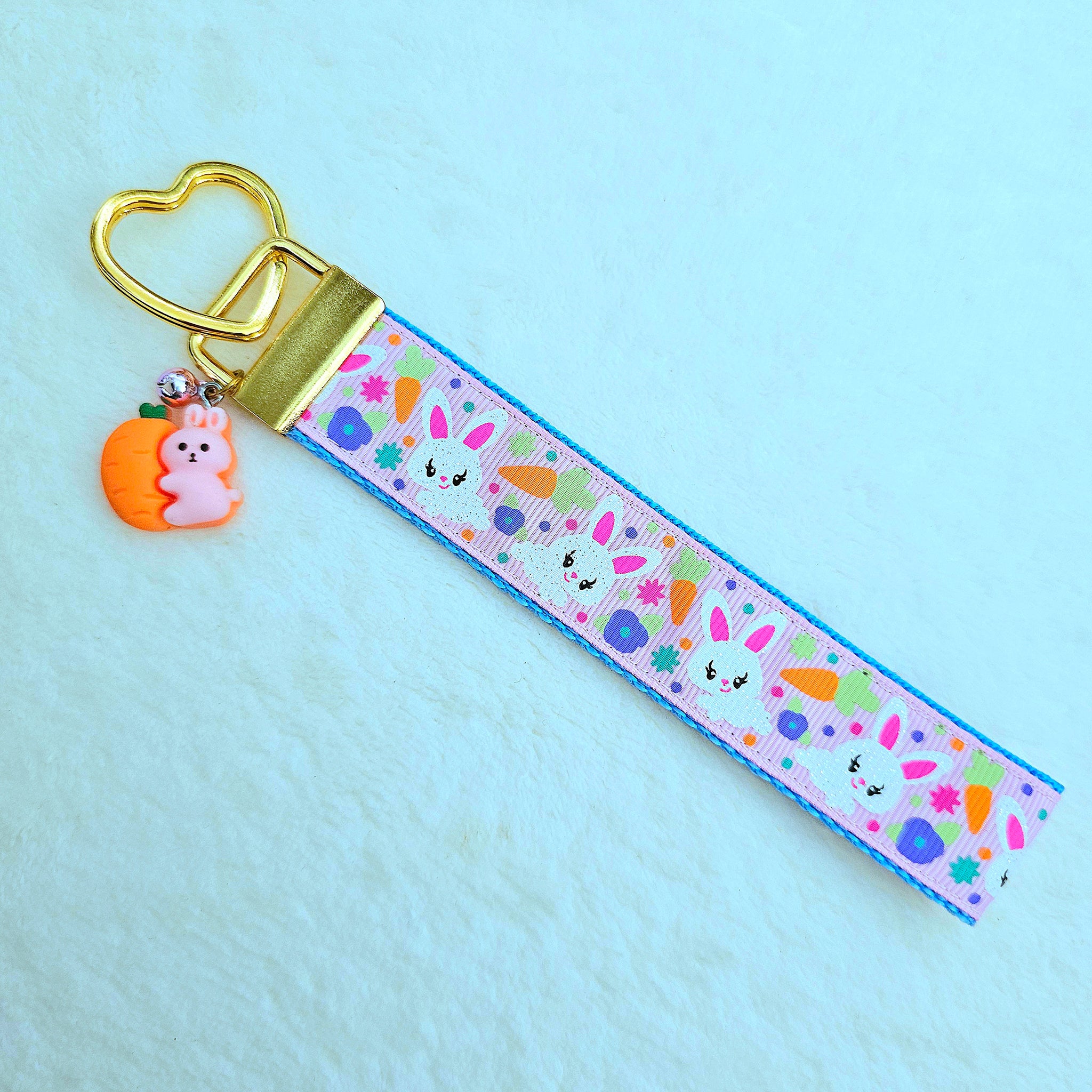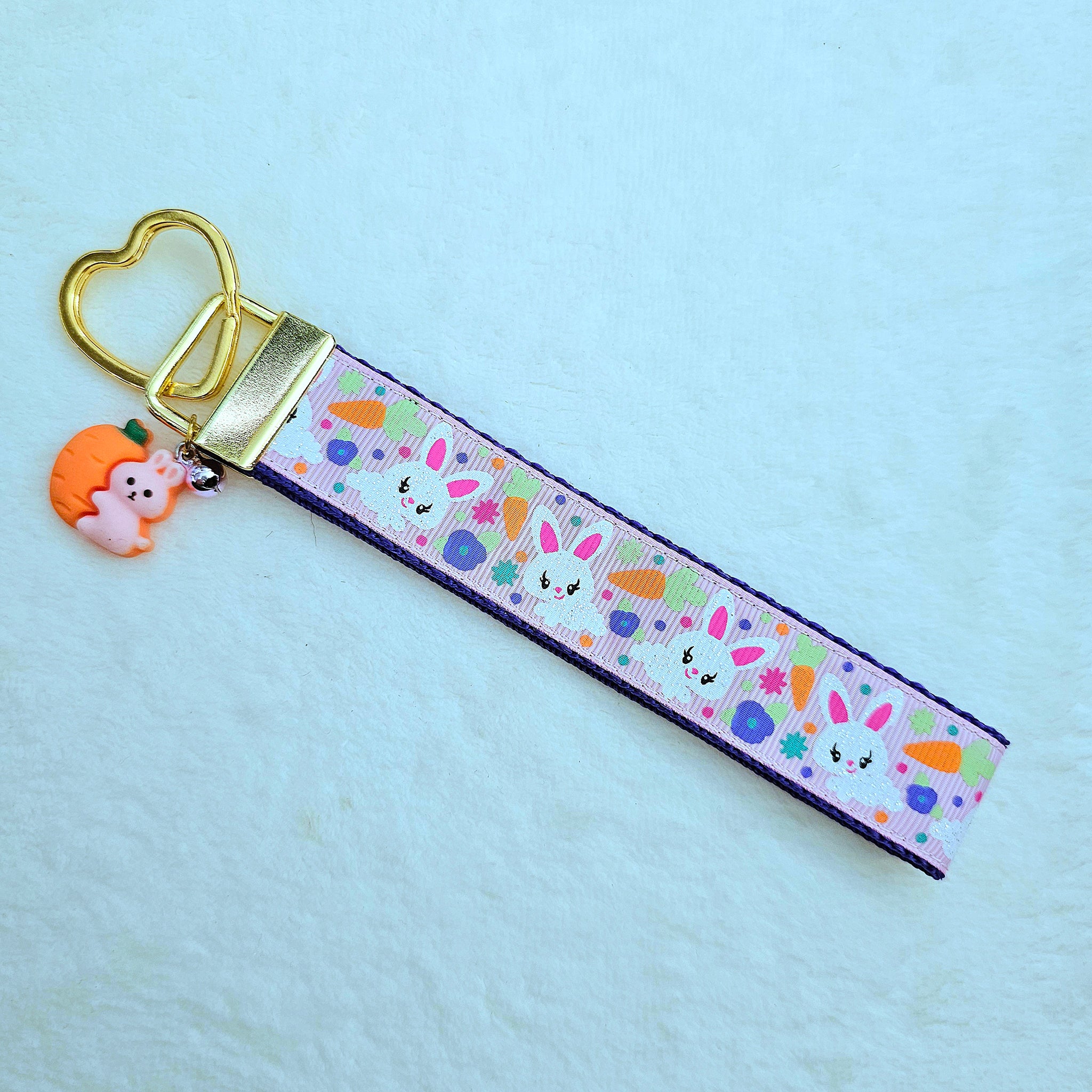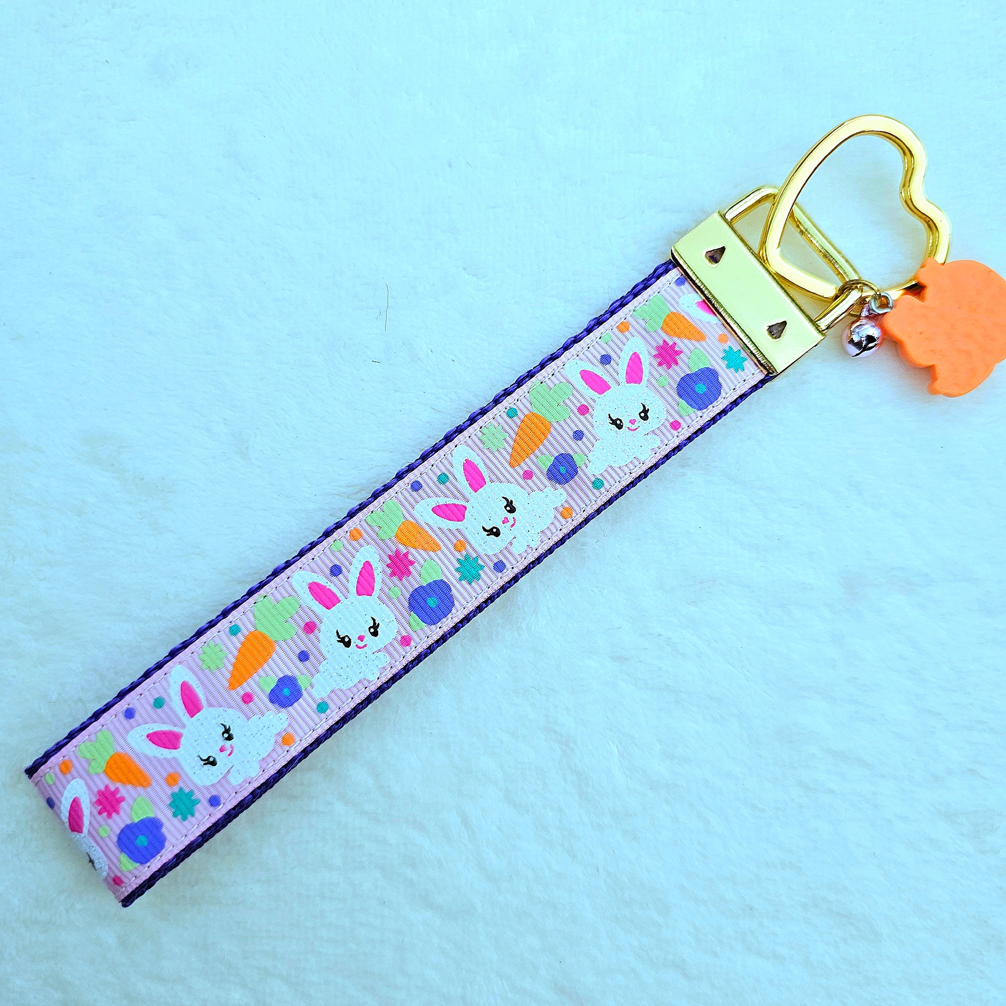 This listing is for a super cute bunny key fob/wristlet. The glittered bunnies are printed on a grosgrain ribbon which is sewn onto a soft propylene webbing, color of your choice.