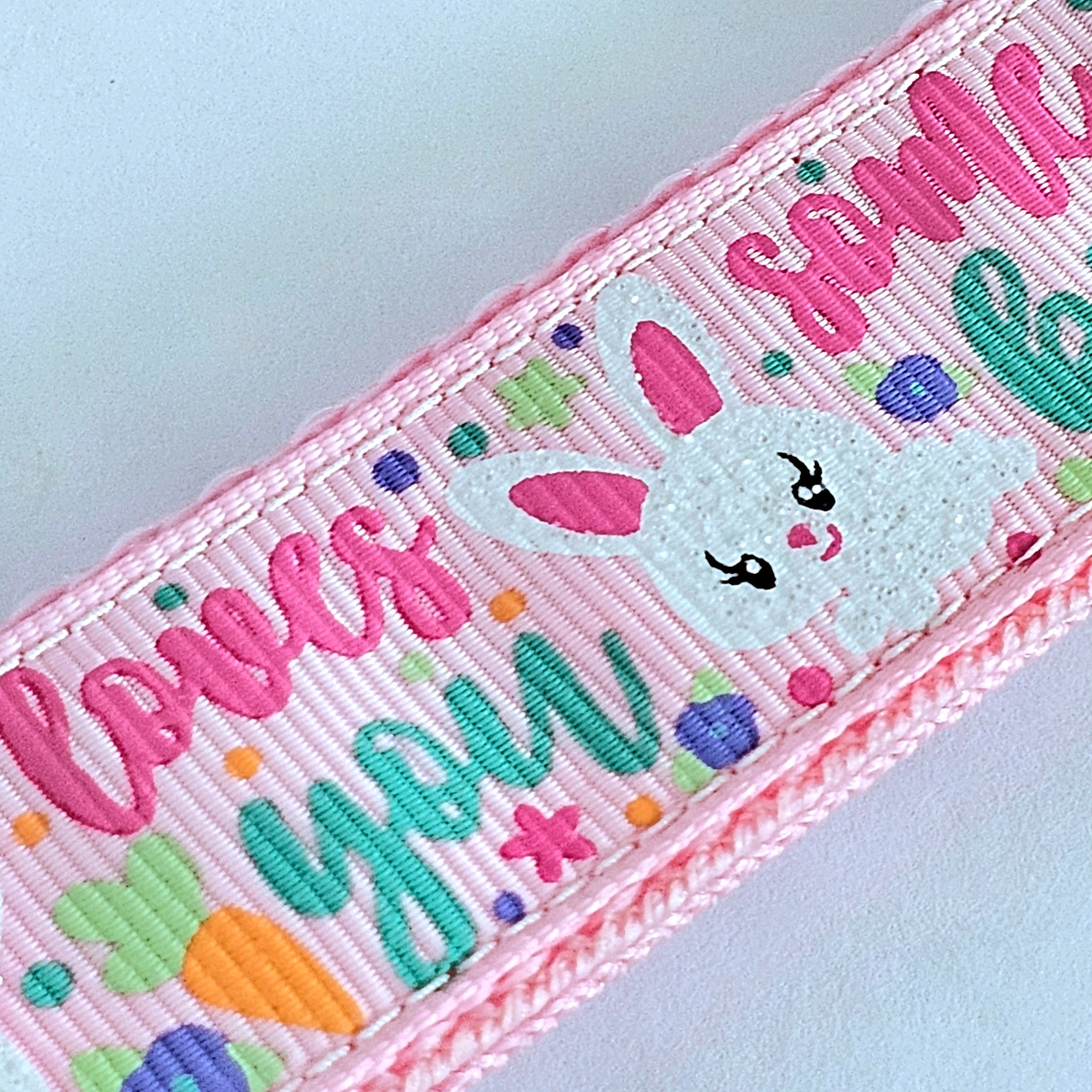 This listing is for a super cute bunny key fob/wristlet. The glittered bunnies are printed on a grosgrain ribbon which is sewn onto a soft propylene webbing.  Right now we only have pink available. It also includes a cute enameled bunny, if you would like a particular color shown please put that in the notes area, or I will try to give you the pink bunny.