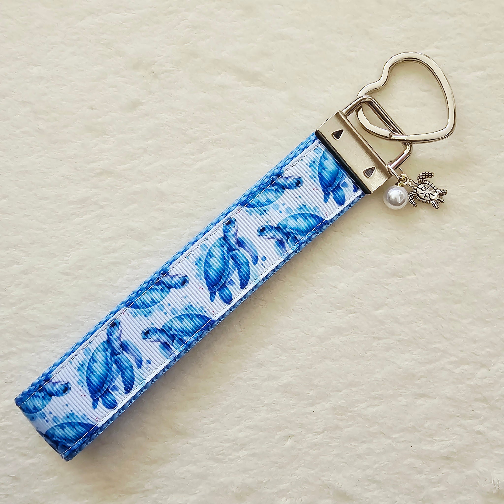 This listing is for a cute sea turtle print key fob with silver hardware on a light blue webbing. It comes with a adorable silver turtle and pearl charm.