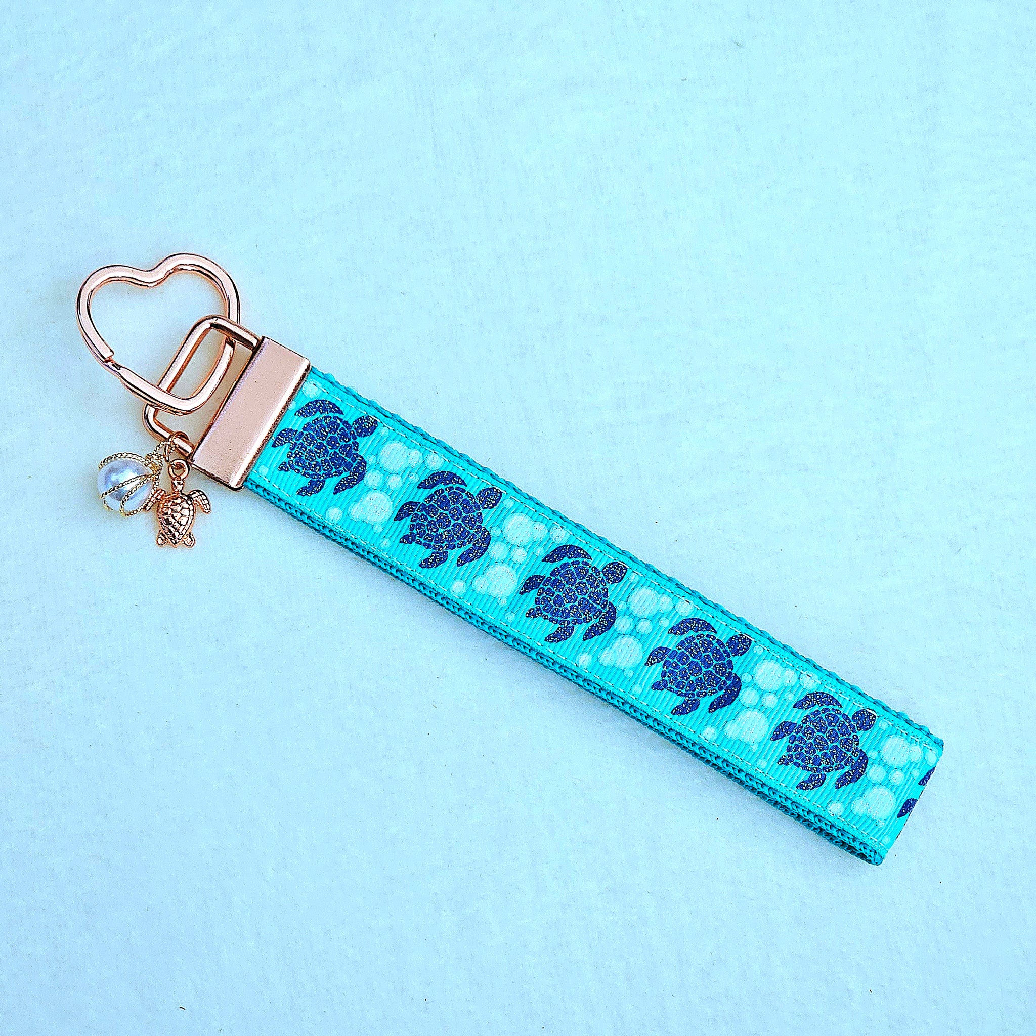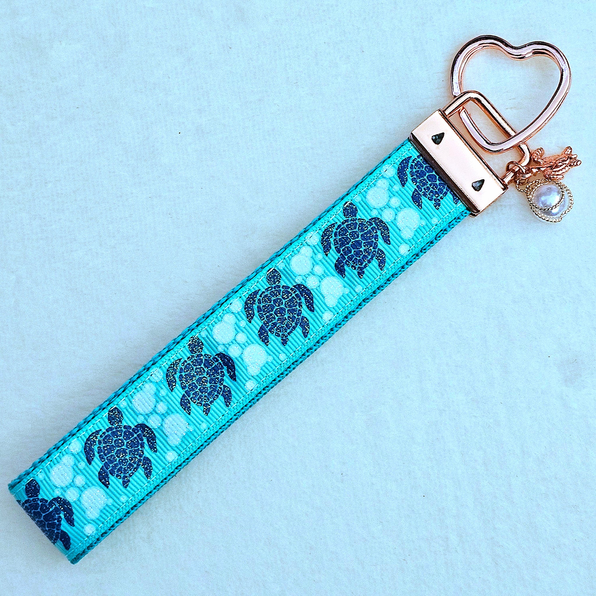 This listing is for a cute sea turtle print key fob with yellow gold hardware on a teal webbing. It comes with a adorable gold turtle charm and a Starfish charm that will vary in color.