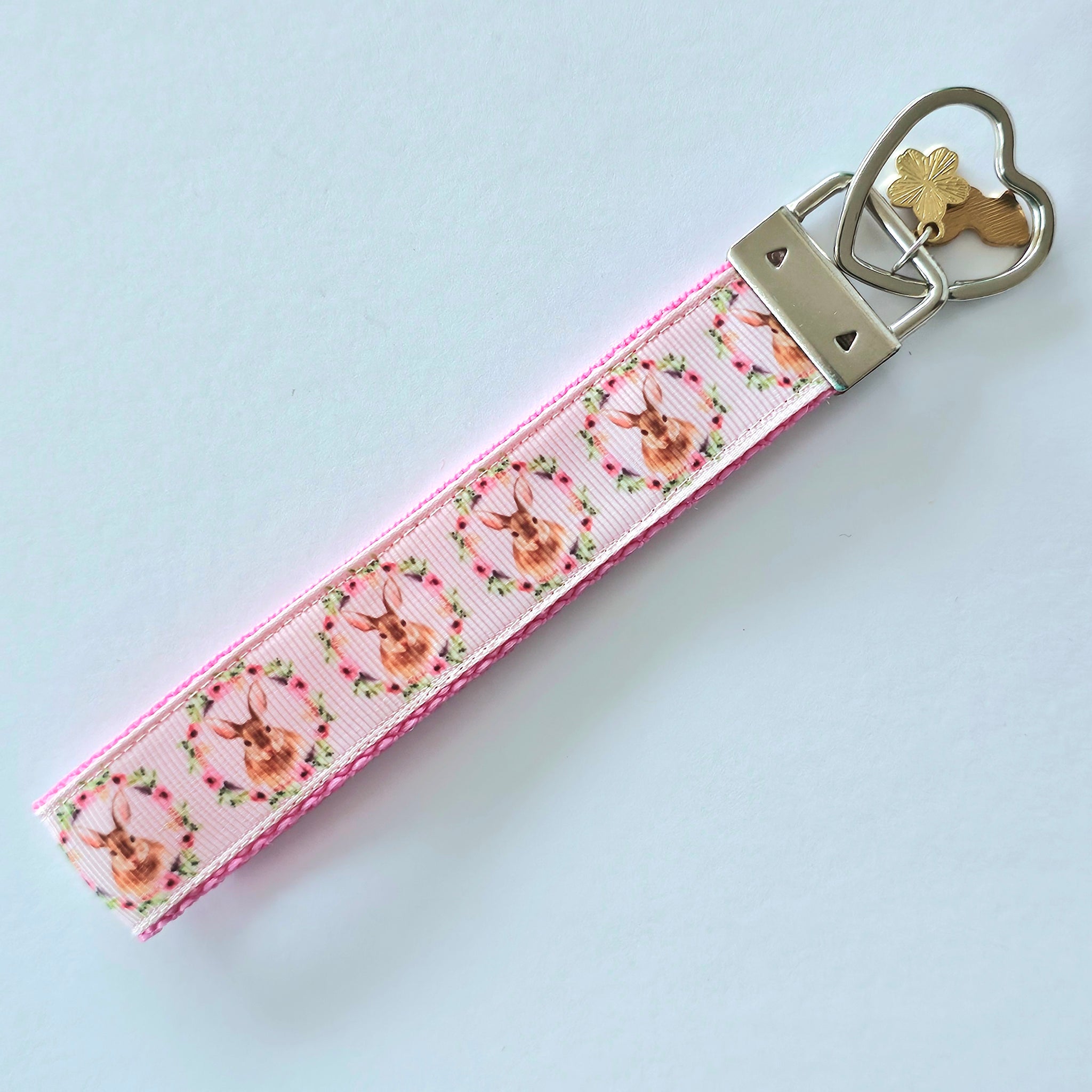 Bunny in a Wreath Silver Key Chain Fob with Rose Charm