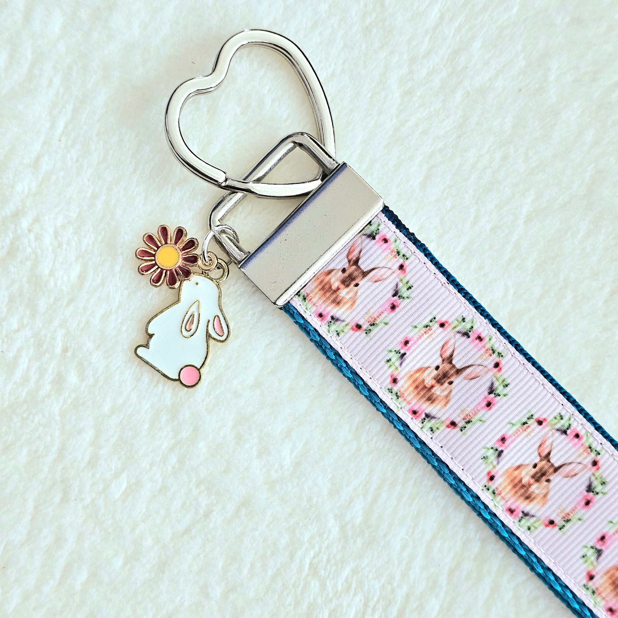 This is for a Bunny in a Wreath print key fob in either pink on silver or teal on rose gold.
